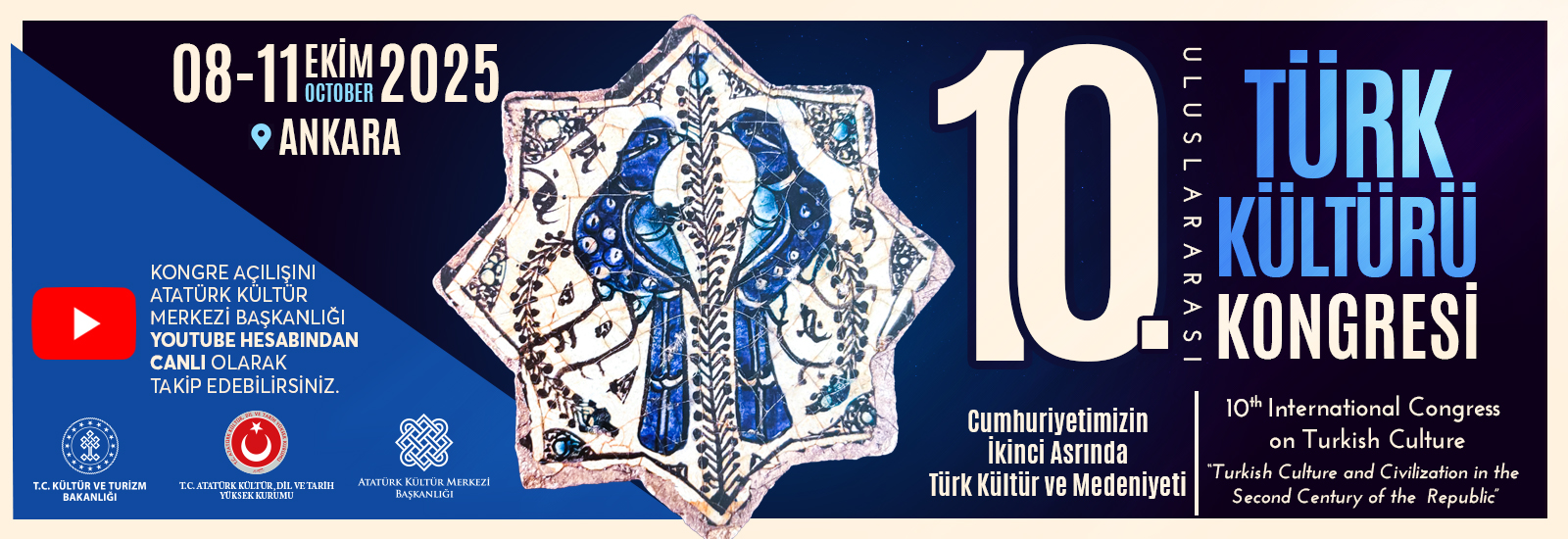 Atatürk Kültür Merkezi Başkanlığı tarafından düzenlenen 10. Türk Kültürü Kongresi, “Cumhuriyetimizin İkinci Asrında Türk Kültür ve Medeniyeti” temasıyla 8-11 Ekim 2025 tarihleri arasında Ankara’da, Atatürk Kültür, Dil ve Tarih Yüksek Kurumu Yerleşkesi’nde gerçekleştirilecektir.