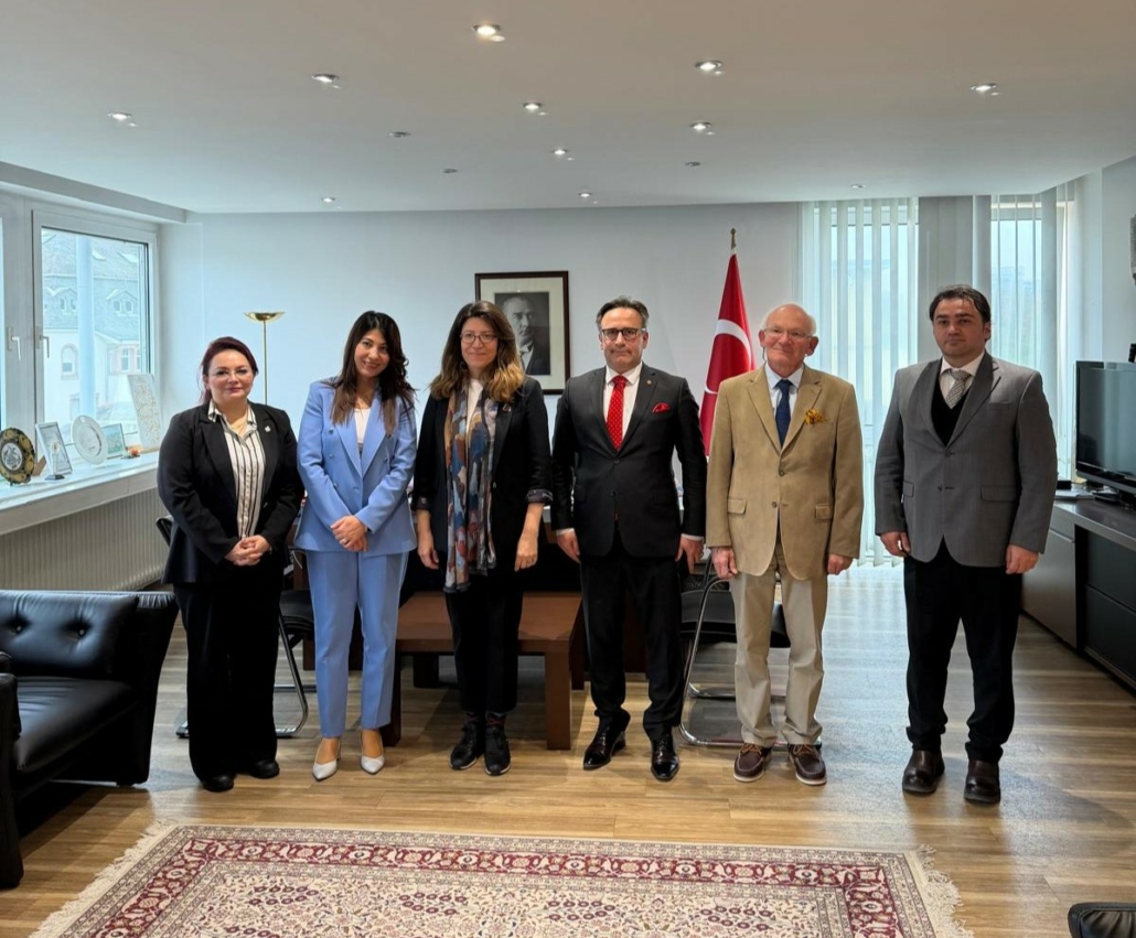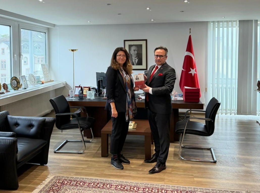 Frankfurt Başkonsolosluğu ziyaretinde, Başkonsolosumuz Sayın Nagihan İlknur Akdevelioğlu’na Eğitim Ataşesi Dr. Fatih Kılıç da eşlik etti. Başkanımız, kurumumuzun yayınlarından Yunus Emre, Atatürk, Fatih Sultan Mehmed, Fuzûlî Dîvânı, Almanca Masallar ve Braille alfabesiyle hazırlanan özel yayın setimizi Sayın Başkonsolos’a armağan etti. Görüşme, iki kurum arasında ilerleyen dönemlerde ortak çalışmalar yapılması temennisiyle sona erdi.