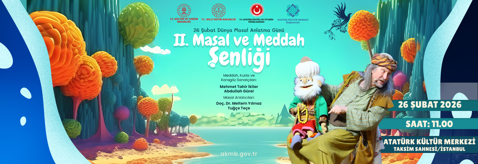 26 Şubat Dünya Masal Anlatma Günü’ne özel olarak ilköğretim öğrencilerine yönelik düzenlenen “Masal ve Meddah Şenliği”nin ilki kukla ve Karagöz sanatçıları ile meddah ve masal anlatıcılarının katılımlarıyla 26 Şubat 2025 tarihinde Ankara’da gerçekleştirilmişti. Çocukların yoğun ilgi gösterdiği bu şenliği geleneksel hâle getirmek ve her yıl 26 Şubat’ta farklı bir ilimizde gerçekleştirmeyi planladık. Bu kez 26 Şubat 2026 Perşembe günü İstanbul, Taksim’deki Atatürk Kültür Merkezi Gösteri Salonu’nda gerçekleştireceğimiz “II. Masal ve Meddah Şenliği”ne İstanbul’un muhtelif ilkokullarında öğrenim gören yaklaşık 800 öğrencinin katılımı beklenmektedir.